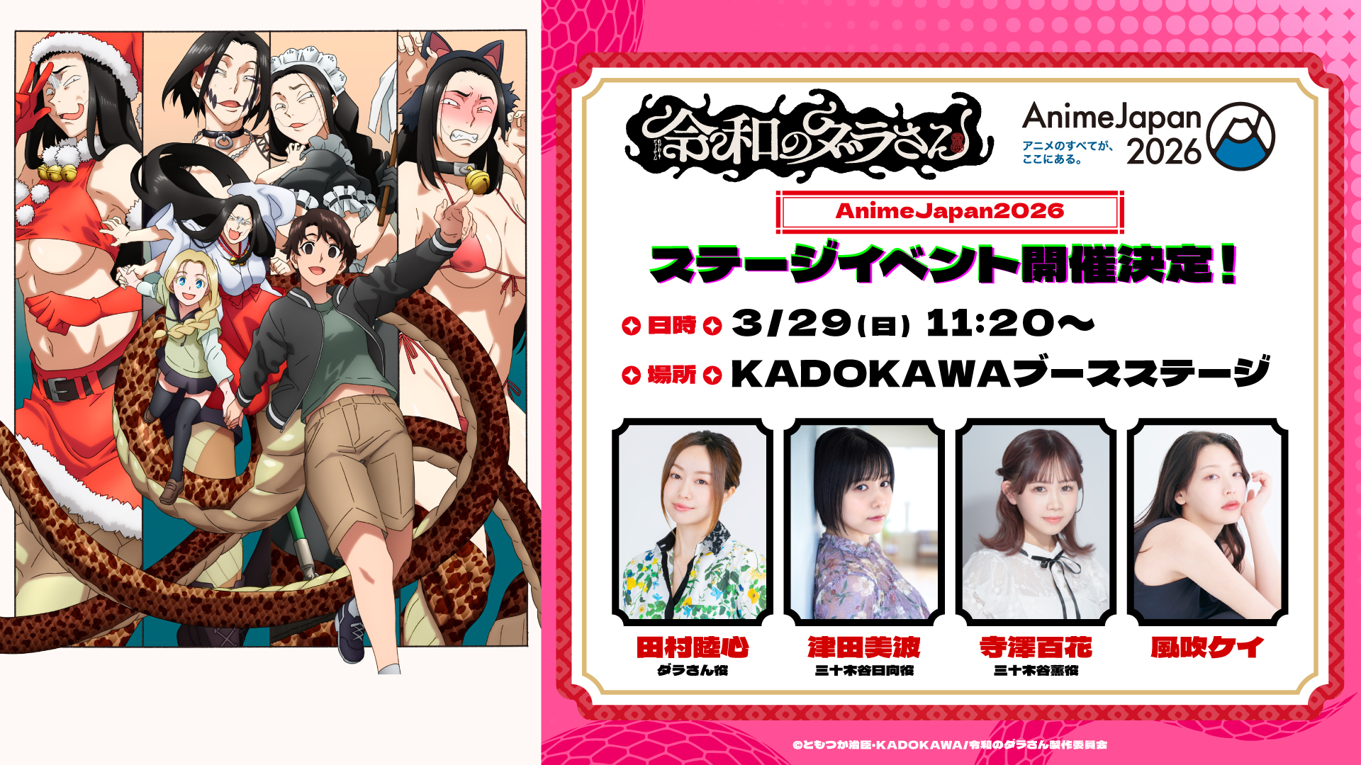 登壇者には、田村睦心(ダラさん役)、津田美波(三十木谷日向役)、寺澤百花(三十木谷薫役)が決定。